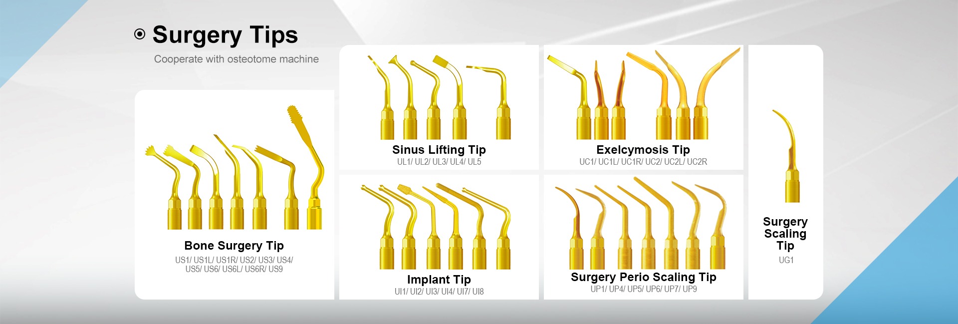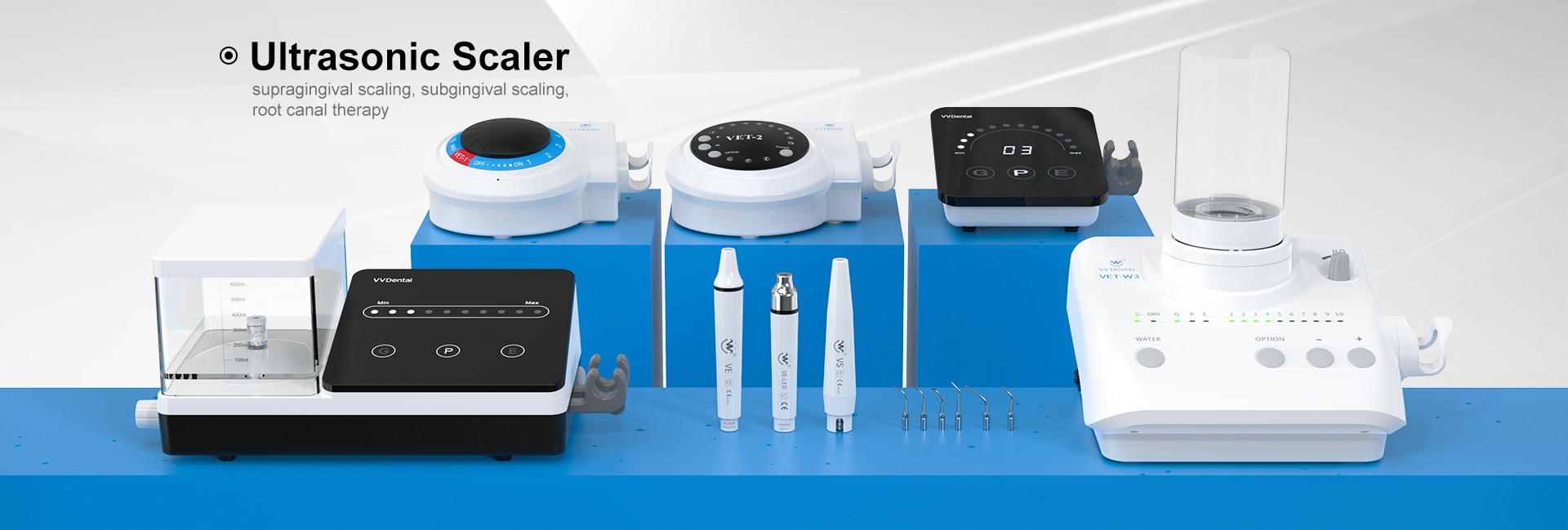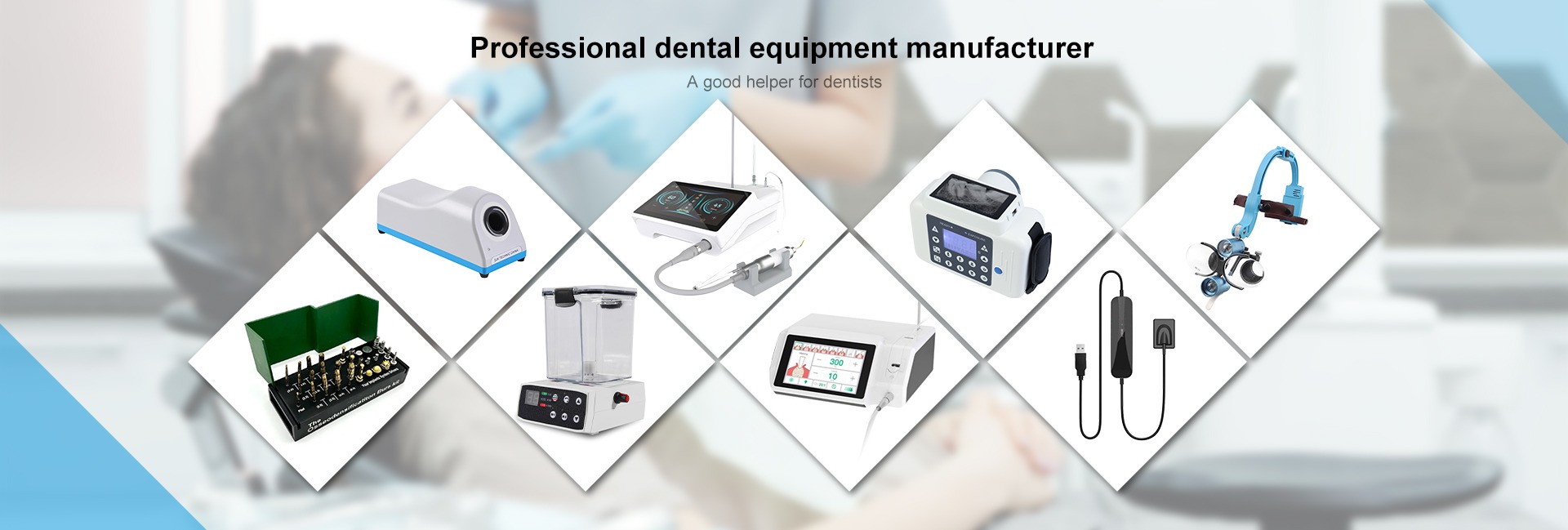 主营产品: 超声波洁牙器,超声波洁牙器尖端,固化光,牙髓声波虹膜激活剂,骨外科尖端